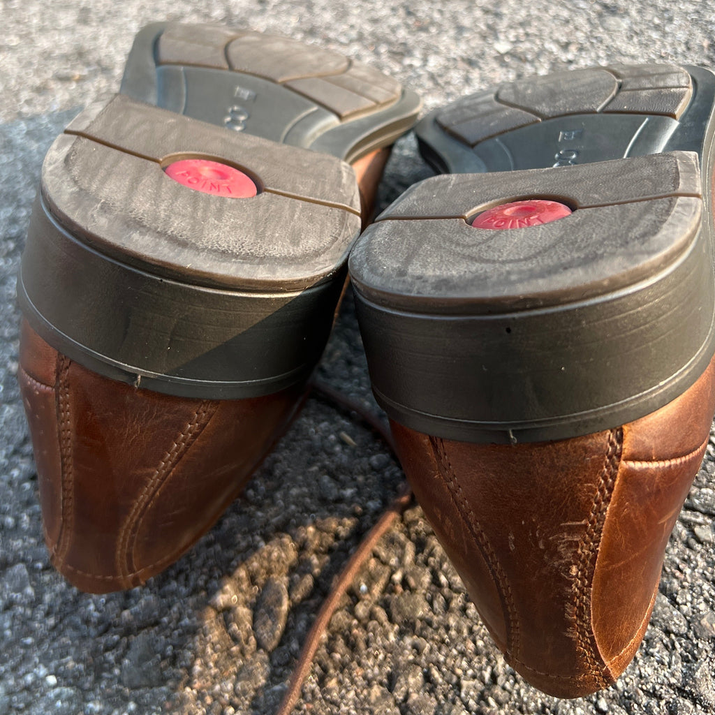 These preowned Men’s Ecco dress shoes are in good condition with just a few light scuffs or stains. They come without any rips, tears, or damage—perfect for adding a touch of style to your collection! Note: the heels show some wear.