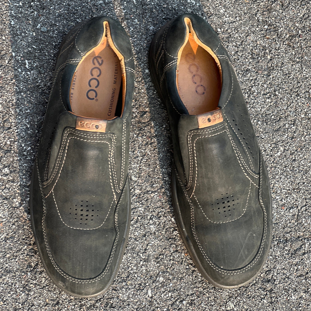 These preowned Men’s Ecco Twin Gored slip-on casual shoes are in solid condition, showing only a few light scuffs or stains. No rips, tears, or damage—just ready to add some easygoing style to your day!