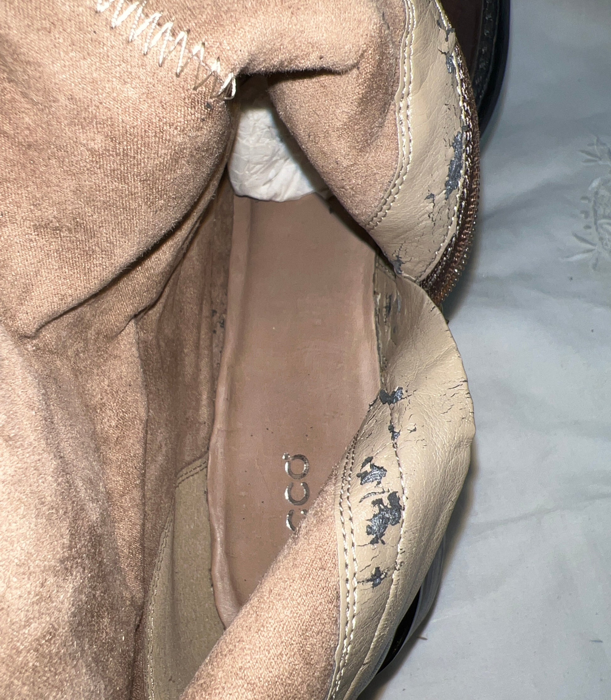 There is a small branding hole in the uppers of both boots (as pictured). This was marked by ecco to void the manufacturer's warranty and to prevent store returns to ecco.